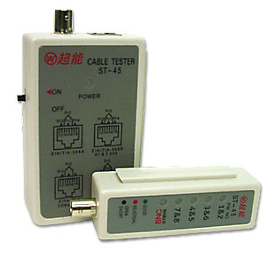 The electronic tester features solid state electronics and is able to check both cables with RJ 45 and BNC connectors. It consists of a local and a remote unit so the 2 ends of the cable do not need to be close by! Very handy when you're testing long cable runs (up to 1,000 ft!). LEDs on both units tell you if all pairs are connected correctly and if not, WHICH pairs are wrong. With BNC connectors it also checks continuity of coaxial cable. Runs on a single 9V battery (sorry, not included!).